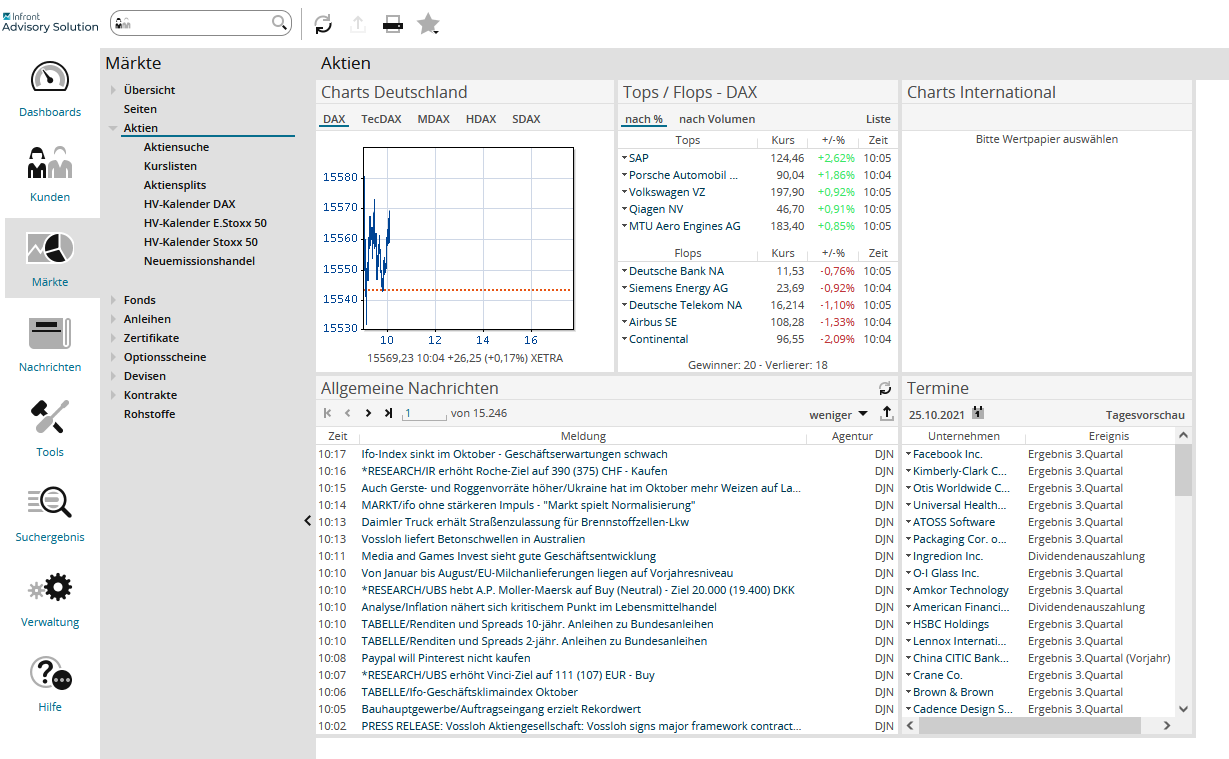 Über das integrierte Menü können Sie auf der Registerkarte "Aktien" darüber hinaus auf folgende Seiten wechseln: