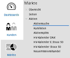 - Wählen Sie dort im Navigator den Menüeintrag "Aktien", "Aktiensuche".
