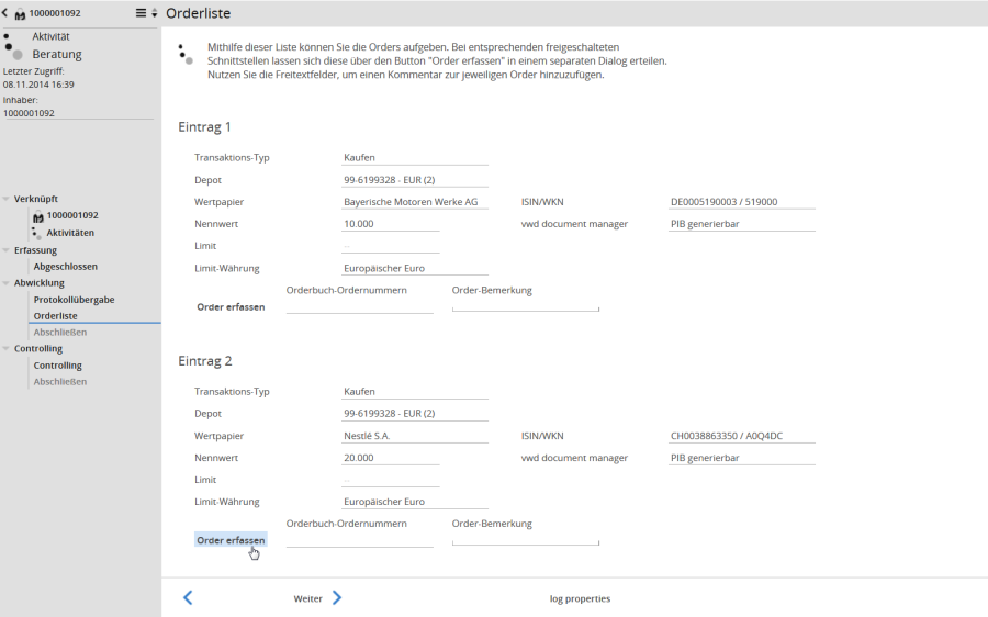 Bei der Abwicklung wird im ersten Schritt die Übergabe des Protokolls dokumentiert. Danach werden die vorgemerkten Transaktionen über einer Orderliste abgewickelt. Mit den entsprechenden freigeschalteten Schnittstellen kann dies auch direkt aus der v über eine Ordermaske erfolgen.