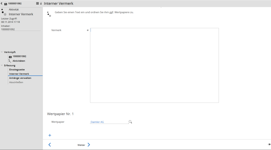 Diese Aktivität ermöglicht es Ihnen, eine kundenbezogene Notiz einschließlich zugeordneter Wertpapiere zu hinterlegen.