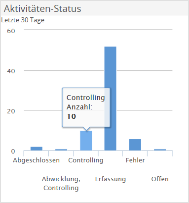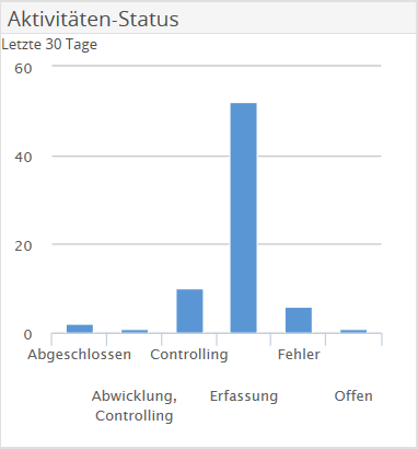 Das Widget "Aktivitäten-Status" zeigt in einem Säulendiagramm die Anzahl der Aktivitäten mit den einzelnen Status ("Abgeschlossen", "Abwicklung, Controlling", "Controlling", "Erfassung", "Fehler" und "Offen" für die letzten 30 Tage.