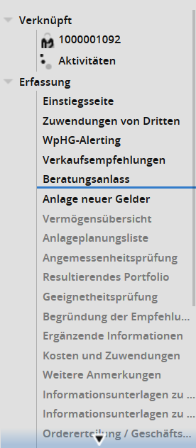 Bereits bearbeitete Schritte werden schwarz, noch nicht bearbeitete grau dargestellt. Bearbeitete Schritte können Sie direkt ansteuern, indem Sie auf den entsprechenden Eintrag klicken. Die aktuell geöffnete Seite wird dann mit einem blauen Strich hervorgehoben.