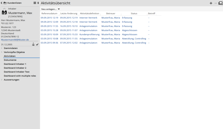 Standardmäßig sind dabei die Spalten ʺReferenzdatumʺ, ʺLetzte Änderungʺ, ʺAktivitätsdefinitionʺ, ʺBetreuerʺ, ʺStatusʺ und ʺBetreffʺ vorhanden, nach denen Sie die Übersicht sortieren können.