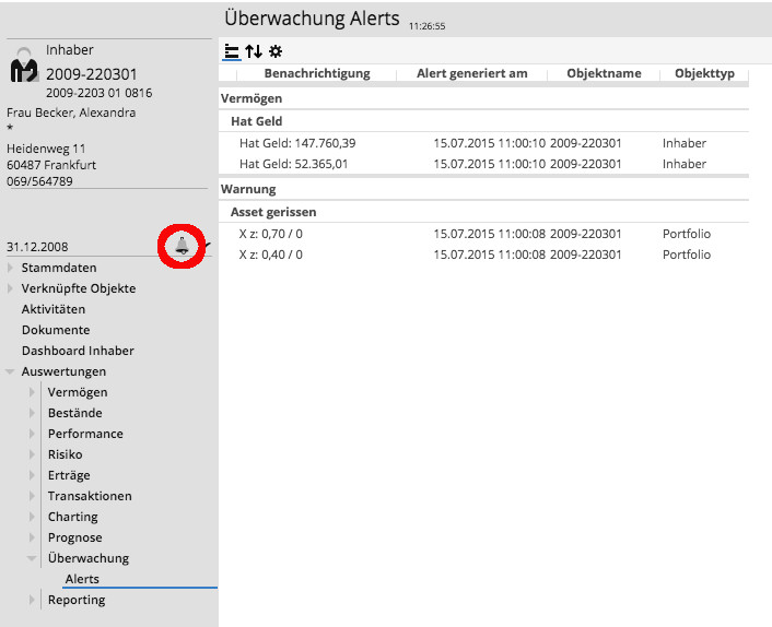 Alerts werden beim Öffnen eines Inhaber- oder Portfolio-Dashboards bzw. des Objektfensters eines Kontos oder Depots ausgewertet.