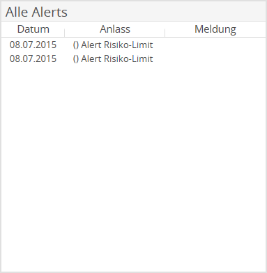 Das Widget "Alerts (Gesamtübersicht)" zeigt die ggf. aktuell ausgelösten Alerts. Standardmäßig werden die 10 aktuellsten Alerts in der Tabelle mit den Spalten "Datum", "Anlass" und "Meldung" dargestellt.