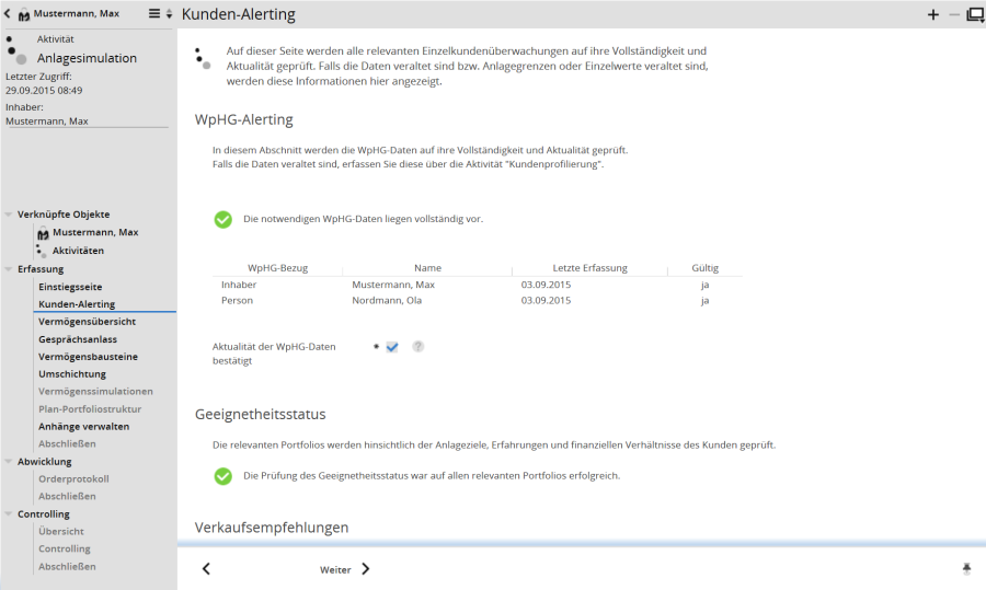 Auf dieser Seite werden die relevanten Einzelkundenüberwachungen auf ihre Vollständigkeit, Aktualität und Geeignetheit überprüft. Wenn die WpHG-Daten veraltet sind oder nicht mehr den Anlagegrenzen des Kunden entsprechen, dann erscheint ein entsprechendes Status-Icon. In diesem Fall sollten Sie die notwendigen Daten über die Aktivität "Kundenprofilierung" erheben, bevor Sie zu dieser Aktivität zurückkehren. Wenn neue Verkaufsempfehlungen seitens der Bank vorliegen, dann erscheinen diese ebenfalls auf dieser Seite und können im Laufe dieser Aktivität gemeinsam mit dem Kunden umgesetzt werden.