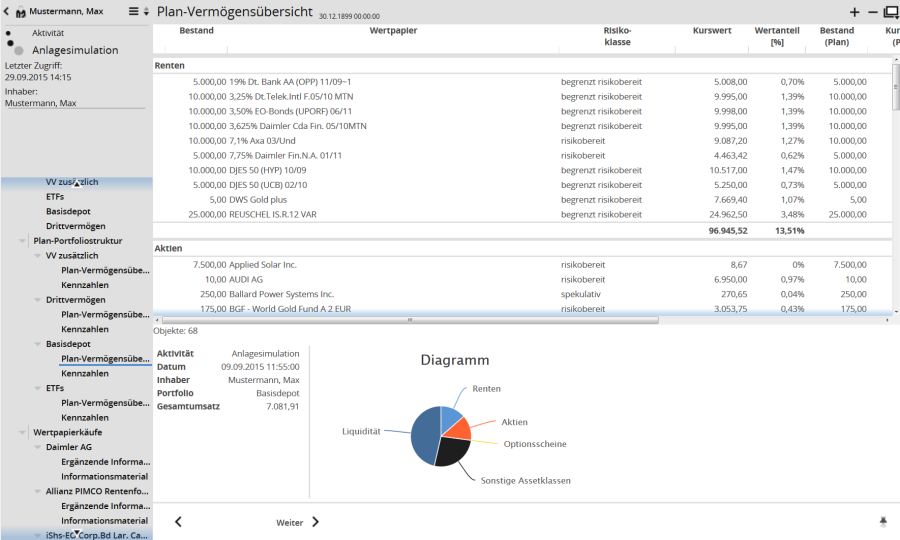 Für jeden Vermögensbaustein wird eine Vermögensübersicht als simuliertes Plan-Portfolio angezeigt.