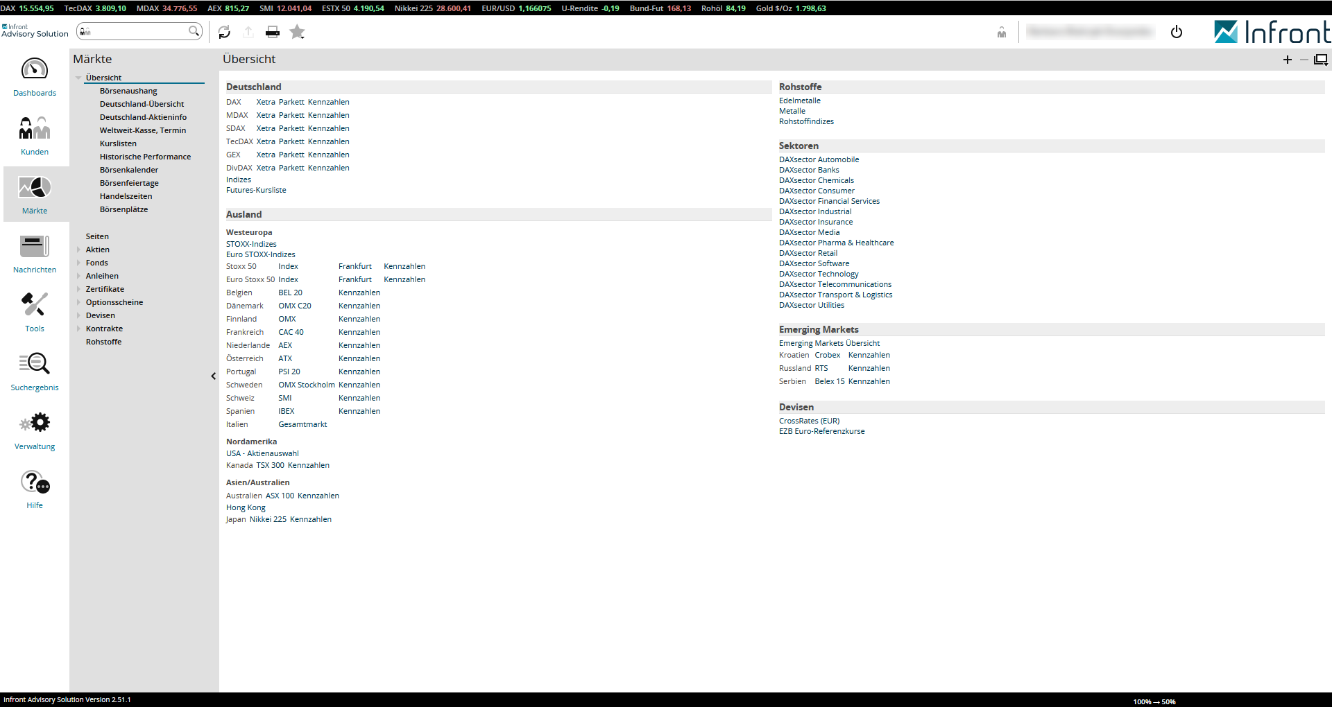 Der Auswertungsbereich zeigt standardmäßig die Seite "Übersicht". Von hier navigieren Sie schnell zu allen wichtigen aktuellen Marktdaten. Um zur Übersichtsseite der jeweiligen Kategorie zu gelangen, klicken Sie direkt auf den jeweiligen Menüeintrag. Möchten Sie weitere Seiten, Kurslisten oder Rechner zu dieser Kategorie öffnen, dann öffnen Sie das jeweilige Menü im Navigator.