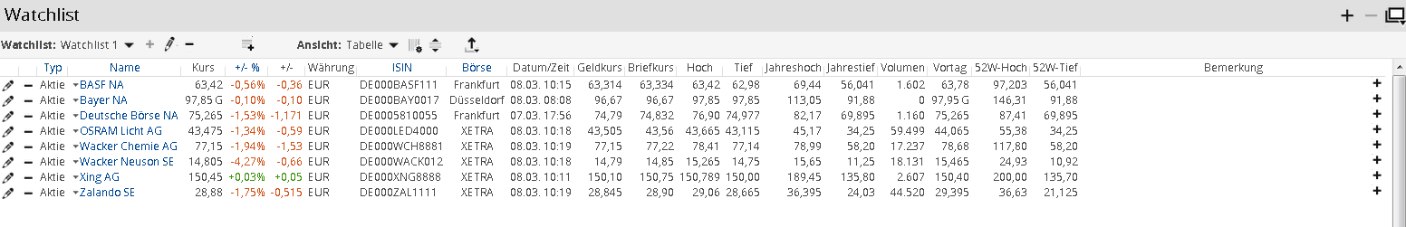 In der Ansicht "Tabelle" sehen Sie die enthaltenen Wertpapiere in der klassischen Listenform: