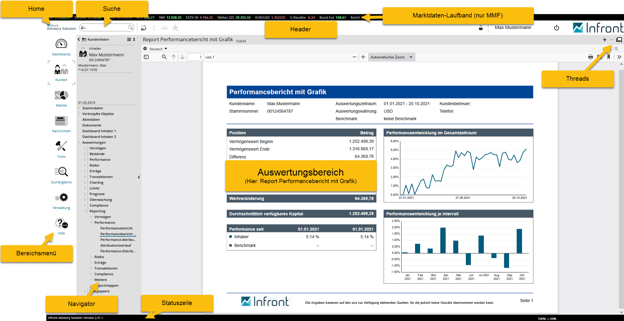 Im Bild sehen Sie die Übersichtsseite des Bereichs "Kunden". Im Auswertungsbereich ist der aus dem Infront Portfolio Manager bekannte Explorer mit Gruppen und Depotfiltern zu sehen. In diesem Beispiel ist das Produkt "Market Manager Financials Web" verknüpft, Sie erkennen das z. B. an den sichtbaren Menüpunkten "Märkte", "Tools" und "Nachrichten" im Bereichsmenü. Lernen Sie in den folgenden Unterkapiteln die einzelnen Bestandteile der Oberfläche kennen.