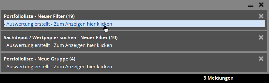 Im erscheinenden Hinweisfenster sehen Sie die im Hintergrund ausgeführten Auswertungen bzw. den Fortschritt der laufenden Auswertungen. Abgeschlossene Auswertungen öffnen Sie per Mausklick.