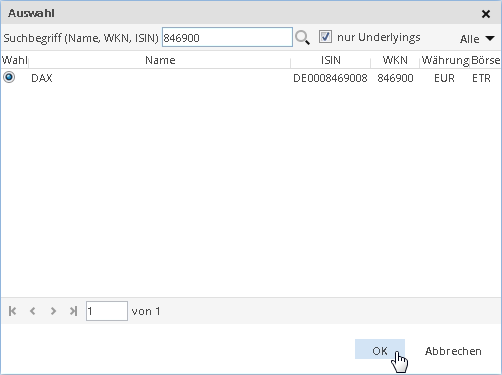 Wählen Sie den DAX im Suchergebnis der Wertpapiersuche aus und bestätigen Sie die Auswahl mit "OK".