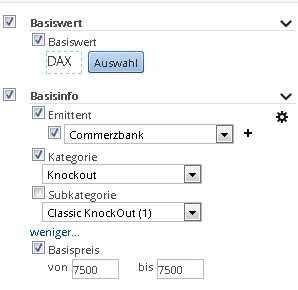 Sie möchten ein Knockout-Zertifikat (Call) der Commerzbank auf den DAX mit Strike 7500 erwerben. Gehen Sie wie folgt vor, um die riesige Menge an Zertifikaten zu filtern und das passende Wertpapier zu finden: