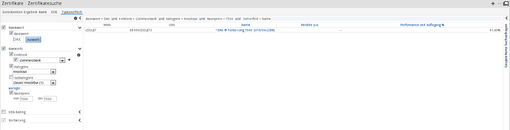 Aktivieren Sie das Kontrollkästchen "Basispreis" und geben Sie in die Felder "von" und "bis" jeweils "7500" ein. Im Suchergebnis sehen Sie nun die gefundenen Zertifikate (in diesem Beispiel genau ein passendes):