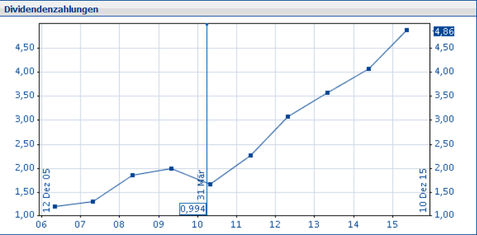 Im Bereich "Dividendenzahlungen" sehen Sie in einem Chart die Entwicklung der Dividendenzahlungen der letzten 10 Jahre.