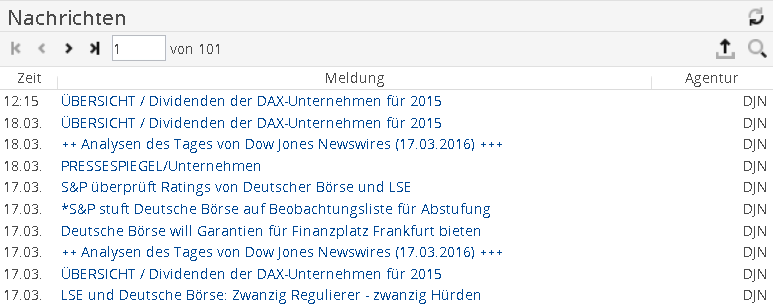 Im Bereich "Nachrichten" finden Sie die Schlagzeilen der aktuellen Nachrichten zum Wertpapier. Dabei erscheinen wie gewohnt die aktuellsten News oben in der Liste. Wählen Sie ggf. die interessanten News per Mausklick aus, um diese zu lesen. Die Nachricht wird dann innerhalb des Wertpapierporträts auf der Registerkarte "Nachrichten" geöffnet. Lesen Sie dazu ggf. auch den Abschnitt Nachrichten im Wertpapierporträt.