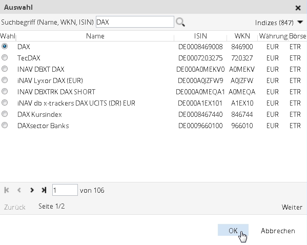 Über die Auswahlliste rechts daneben können Sie die Suche auf bestimmte Wertpapiertypen einschränken (im Bildbeispiel "Indizes"). Standardmäßig wird nach allen Typen gesucht (Auswahl "Alle"). Die Zahlen in Klammern zeigen die Anzahl der gefundenen Wertpapiere dieses Typs. - Wählen Sie den gewünschten Basiswert in der Liste und bestätigen Sie die Auswahl mit "OK".