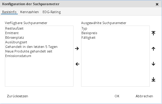 Im erscheinenden Dialogfenster "Konfiguration der Suchparameter" können Sie die Parameter ein- und ausblenden, deren Reihenfolge ändern oder die Standardeinstellung wiederherstellen. Über die Registerkarten oben im Dialogfenster wechseln Sie zwischen den einzelnen Bereichen der Suchparameter, im Beispiel "Basisinfo", "Kennzahlen" und "EDG-Rating" (Suche nach Optionsscheinen). Die Parameter auf der rechten Seite ("Ausgewählte Suchparameter") sind aktuell in der Suchmaske eingeblendet. Auf der linken Seite sehen Sie die aktuell ausgeblendeten Parameter. Im Einzelnen haben Sie folgende Möglichkeiten: