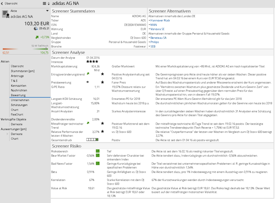 Über den Menüeintrag "Bewertung" erhalten Sie aktuelle Analysedaten von theScreener zu über 6000 Unternehmen aus 37 Ländern weltweit. Dies entspricht einer Gesamtmarktkapitalisierung von 95%. Die Aussagen beinhalten fundamentale Kriterien, technische Analysen sowie eine Risikomessung und werden zweimal wöchentlich aktualisiert.