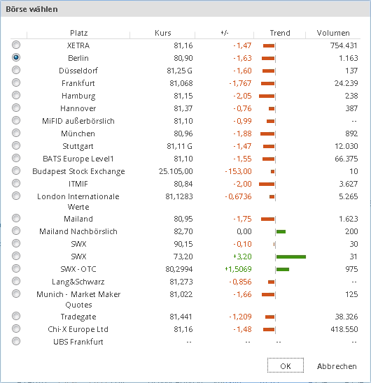 Im erscheinenden Dialogfenster "Börse wählen" können Sie dann den gewünschten Platz durch das Markieren der zugehörigen Option auswählen und mit "OK" bestätigen.