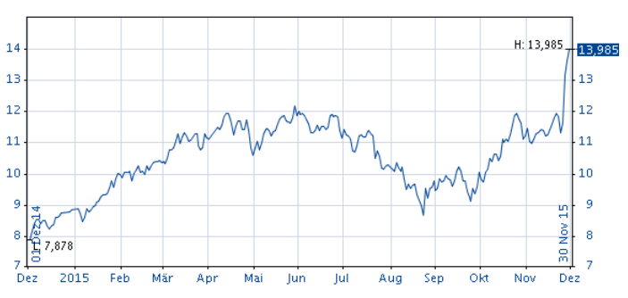 Haben Sie Vergleichswerte bzw. Benchmarks eingeblendet, so werden diese immer als Liniencharts dargestellt. Lesen Sie dazu ggf. auch den Abschnitt Vergleichswerte einblenden.