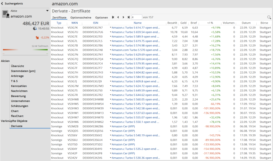 Ein Mausklick auf die Wertpapierbezeichnung (Spalte "Name") öffnet das Porträt des Derivats.