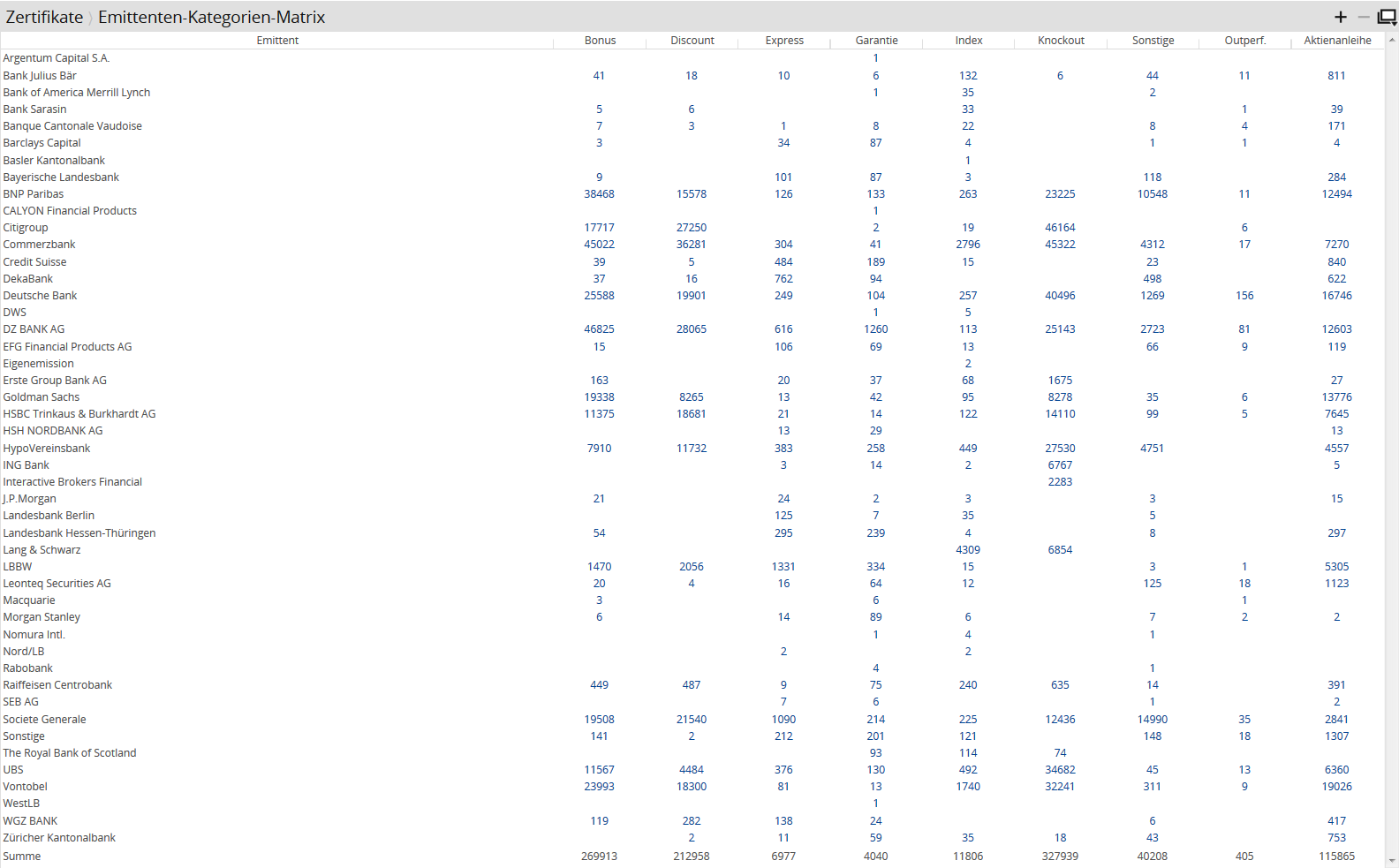 Die Matrix zeigt Ihnen auf einen Blick, wie viele Zertifikate die einzelnen Emittenten nach Zertifikat-Typen gegliedert anbieten. Darüber hinaus entnehmen Sie der Emittenten-Kategorien-Matrix auch die Gesamtzahl des jeweiligen Zertifikat-Typs (Zeile "Summe"). So haben Sie Zugriff auf alle Informationen, die Sie für einen schnellen und umfassenden Überblick über den Zertifikatemarkt benötigen.