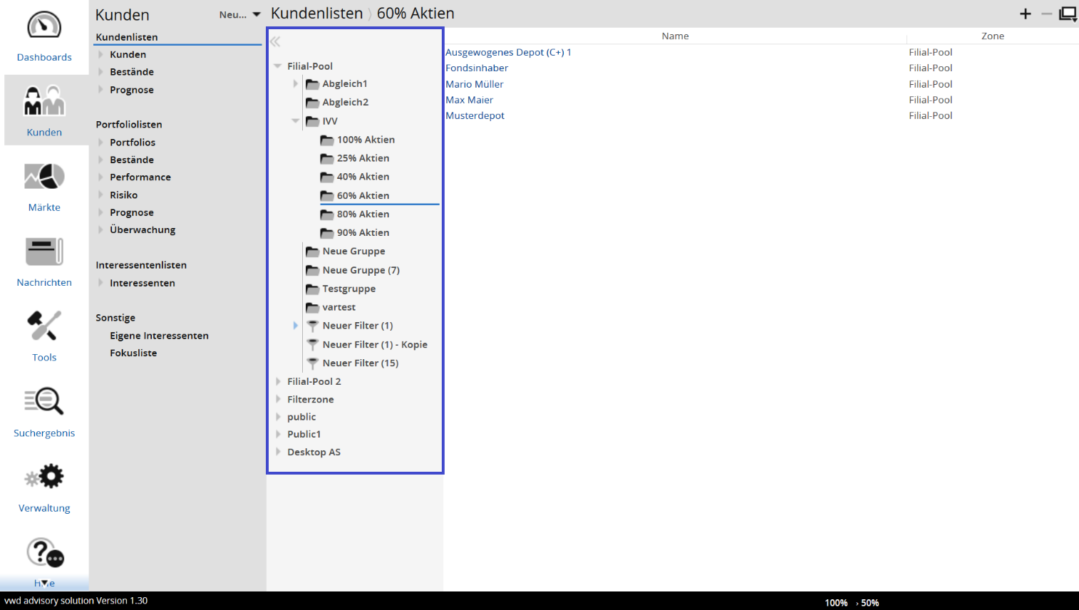 Im Bereich "Kunden" sehen Sie rechts vom Navigator den Explorer. Benutzern des Infront Portfolio Manager ist dieser – in etwas komplexerer Form – bereits bekannt. Hier sehen Sie die für Sie (über die Benutzerverwaltung) freigeschalteten Zonen. Klappen Sie diese "Ordner" mithilfe des Pfeils auf, um die Objekte darunter zu sehen und per Mausklick auszuwählen. Hier finden Sie Gruppen und Depotfilter mit Depotobjekten. Per Mausklick öffnen Sie die Listen mit Inhabern, Portfolios oder Interessenten im Auswertungsbereich.