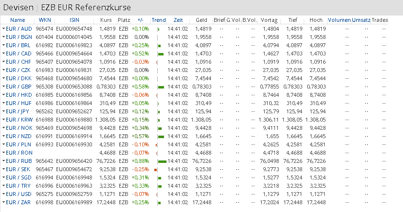 Wählen Sie den Menüeintrag "EZB-Euro-Referenzkurse" im Navigator, um die Liste der Euro-Referenzkurse zu öffnen.