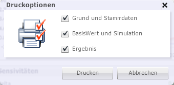 Icon "Drucken" Wählen Sie dieses Icon, um die aktuelle Ansicht des OS-Rechners zu drucken. Im erscheinenden Dialogfenster "Druckoptionen" legen Sie vor dem Drucken noch die auszudruckenden Bereiche fest: Wählen Sie abschließend den Button "Drucken", um den Druckauftrag an den Drucker zu senden. | |