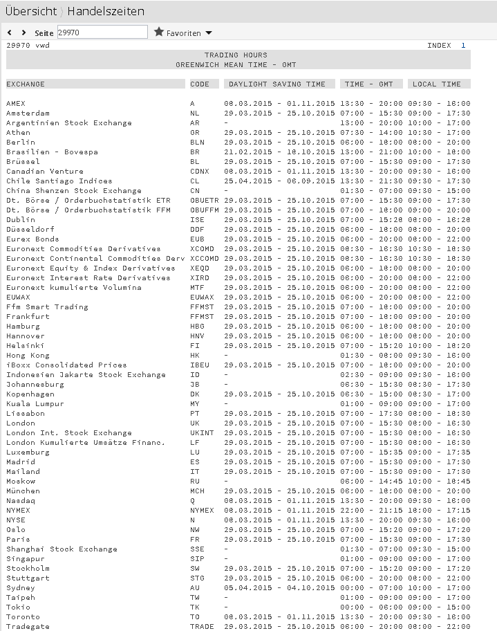 Wählen Sie den Menüeintrag "Handelszeiten", um über die vwd-Seite 29970 die exakten Handelszeiten internationaler Börsen einzusehen.