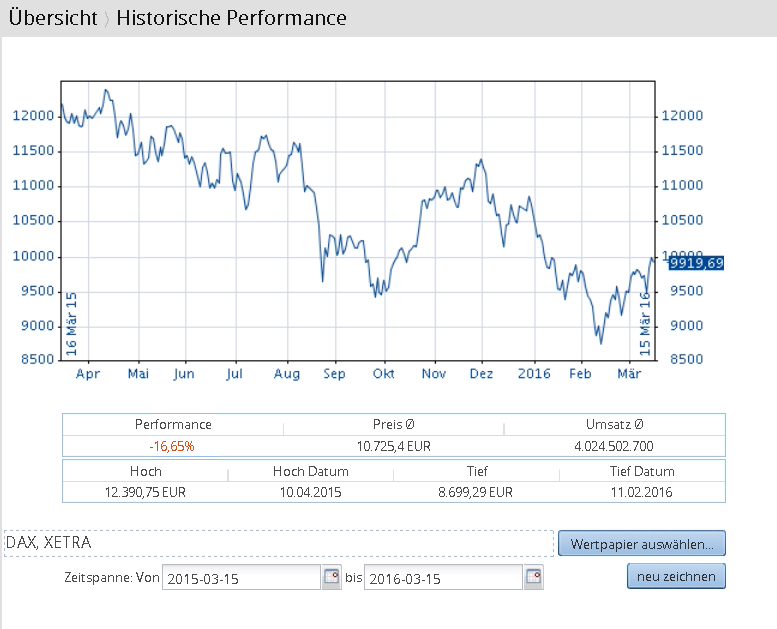 Suchen Sie nach dem gewünschten Wertpapier (Standardeinstellung "DAX XETRA") und stellen Sie den gewünschten Analysezeitraum ein.