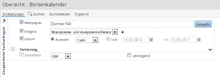 Sortierung | Wählen Sie hier die Spalte, nach der das Suchergebnis im Börsenkalender sortiert werden soll. Über die Option "Absteigend" können Sie die Sortierung der Spalte umkehren. |