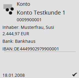 Im Objektfenster wird für Konten unter der Navigator-Toolbar deren Steckbrief angezeigt. Der Steckbrief enthält abhängig von der Verfügbarkeit z. B. folgende Informationen: