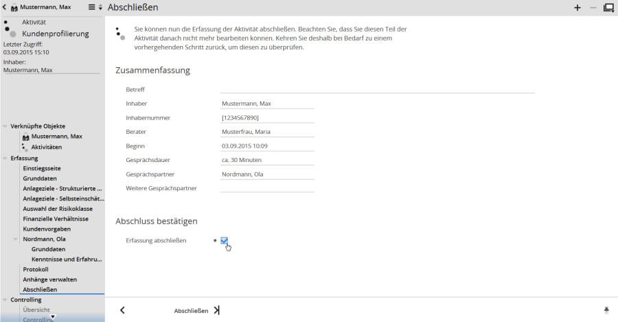 Bestätigen Sie die erfassten Daten, indem Sie das Kontrollkästchen "Erfassung abschließen" aktivieren.