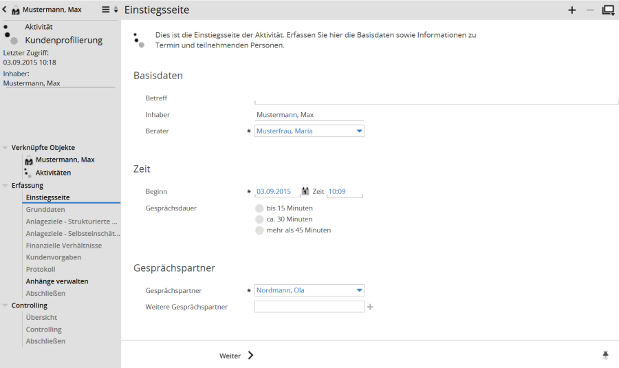 Auf der Einstiegsseite der Aktivität können Sie die Basisdaten zum Termin einsehen und erfassen. Im Einzelnen sehen Sie folgende Elemente: