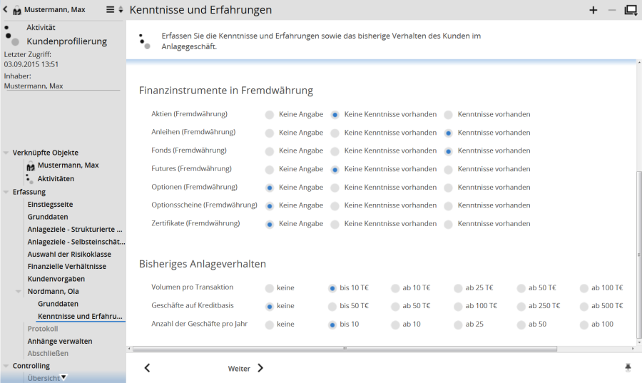 Erfassen Sie die Kenntnisse und Erfahrungen sowie das bisherige Verhalten des Kunden im Anlagegeschäft.