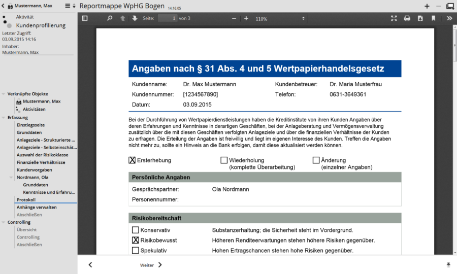 Bei diesem Schritt wird aus den bisherigen Angaben das Protokoll generiert. Das Protokoll können Sie als PDF speichern bzw. öffnen. Anschließend können Sie es ausdrucken und dem Kunden übergeben oder zusenden. Nach dem Abschließen der Aktivität werden die Protokolle jedoch auch automatisch archiviert. So können Sie das entsprechende Protokoll in der Aktivität auf der Seite "Abgeschlossen" oder in der Inhaber-Ansicht unter ʺDokumenteʺ einsehen.