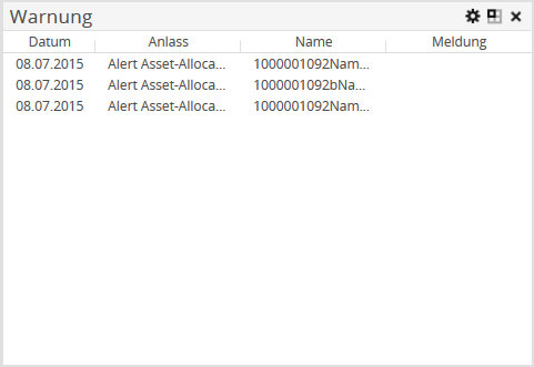 Das Kundenwidget "Alerts" liefert Ihnen den Überblick über die zuletzt ausgelösten Alerts für den Inhaber. Standardmäßig werden die 10 aktuellsten Alerts in der Tabelle mit den Spalten "Datum"; "Anlass", "Name" und "Meldung" dargestellt.