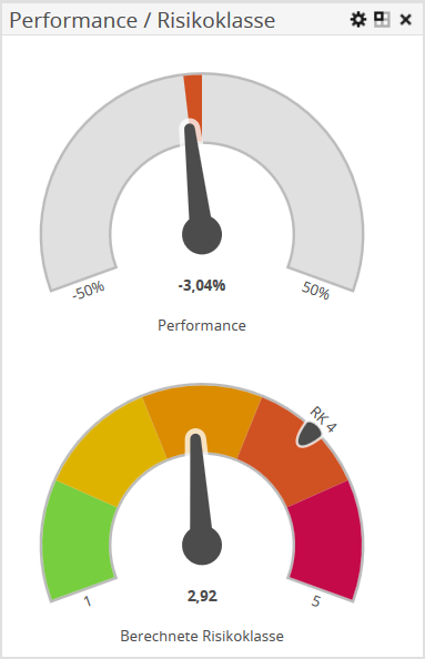 Das Kundenwidget "Performance/Risikoklasse" zeigt in zwei Diagrammen die Performance und die errechnete Risikoklasse des Inhabers. Über die Zeiger sehen Sie sofort Risikoklasse und Performanceentwicklung. Die exakten berechneten Werte stehen unter den Zeigern.