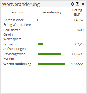 Für jede Position sehen Sie in der Spalte "Veränderung" die Entwicklung seit dem eingestellten Startdatum sowie in der Spalte "Betrag" die absolute Veränderung in der ausgewählten Währung.