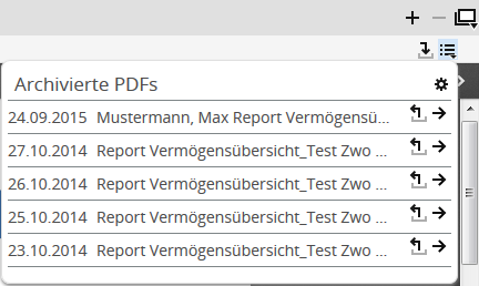 Über das Icon "Dokumenten-Archiv" können Sie sich die bereits abgelegten Versionen des aktuell geöffneten Reports in einer Liste anzeigen lassen. Darin enthalten sind alle Reports, die dem aktuell sichtbaren entsprechen und dem aktuell angezeigten Depotobjekt zugeordnet sind. Im Bildbeispiel unten sind also nur Versionen des Reports Vermögensübersicht des Inhabers "Max Mustermann" zu sehen. Diese Liste (bzw. das Icon "Dokumenten-Archiv") ist nur mit der entsprechenden Berechtigung sichtbar.