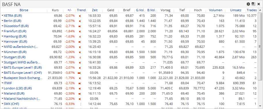 Über die Links in der Spalte "Börse" wechseln Sie direkt aus dem Arbeitsbereich in das entsprechende Wertpapierporträt dieser Kursnotierung.