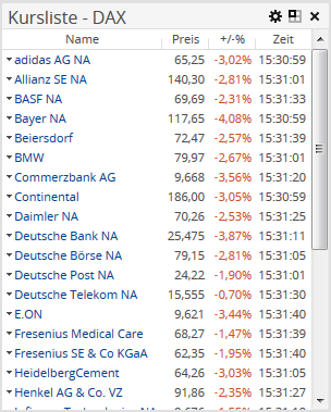 Das Marktdatenwidget "Kursliste" zeigt für einen ausgewählten Index alle Wertpapiere alphabetisch sortiert in einer Kursliste mit den Spalten "Name", "Preis", "+/-%" und "Zeit".