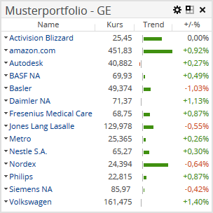 Das Marktdatenwidget "Musterportfolio" zeigt für das ausgewählte Musterportfolio den aktuellen Stand über die Spalten "Name", "Kurs", Trend" (als Balkengrafik) und "+/-%".