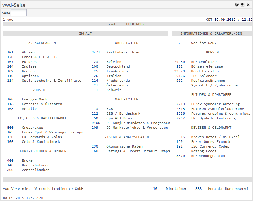 Das Marktdatenwidget "vwd-Seite" zeigt die bekannten vwd-Seiten an. Wie gewohnt können Sie in das Eingabefeld "Seite" die gewünschte Seitennummer eingeben (z. B. "5009" für "DAX-XETRA") und mit <RETURN> bestätigen, um zu dieser Seite zu wechseln.