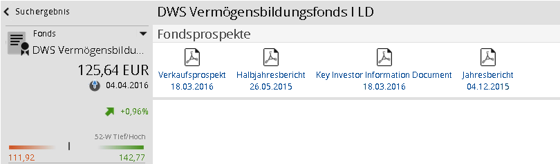 Für Wertpapiere vom Typ "Fonds" finden Sie im Navigator des Wertpapierporträts über den Menüeintrag "Fondsprospekte" die verfügbare Dokumentation zum Fonds.