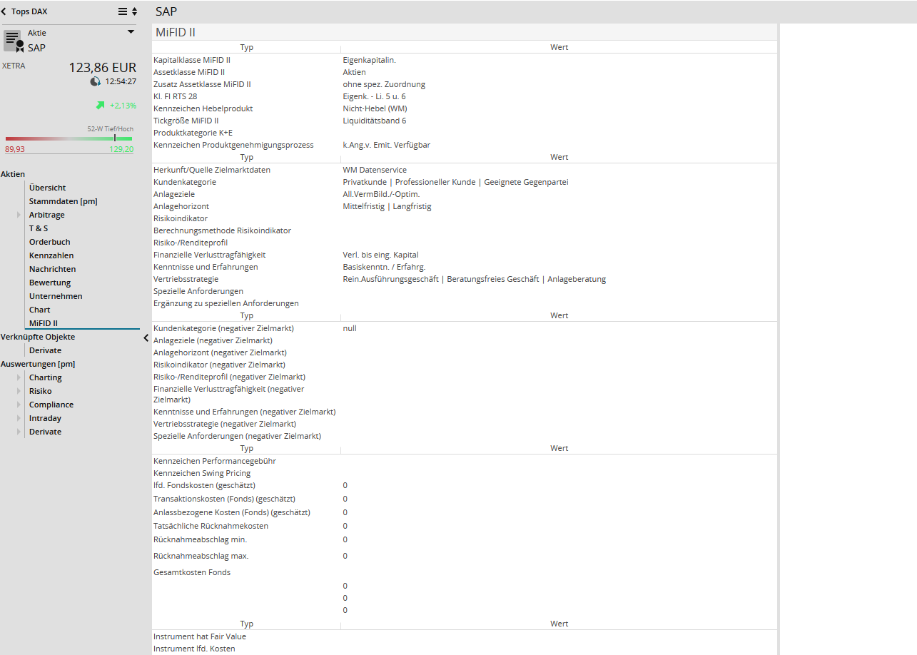 Wählen Sie den Menüeintrag "MiFID II" im Wertpapierporträt, um die wichtigsten MiFID-II-Daten zum Wertpapier in kompakter Form zu sehen.