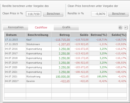 Auf der Mini-Registerkarte "Cashflow" sehen Sie alle relevanten Zahlungsströme während der Haltedauer bzw. der Laufzeit der Anleihe in einer Tabelle.