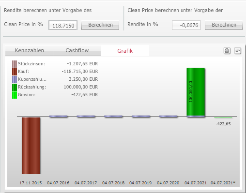 Auf der Mini-Registerkarte "Grafik" sind alle relevanten Zahlungsströme während der Haltedauer bzw. der Laufzeit der Anleihe grafisch aufbereitet.